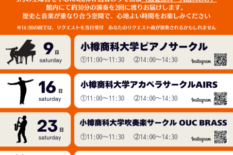歴史的建造物の中に、学生たちの音楽がやさしく響き渡る特別な時間小樽商科大学の音楽系サークルによる演奏会を開催いたします。 5月の土曜日を中心に、4団体が週替わり…2026年04月13日 -