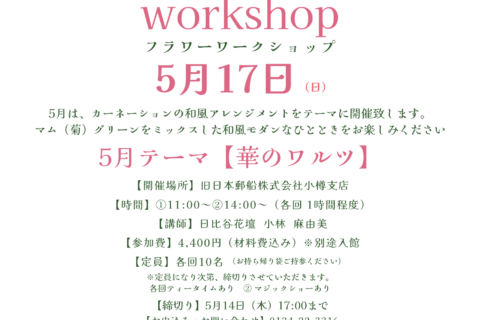 5月は、カーネーションの和風アレンジメントをテーマに開催致します。 マム(菊)グリーンをミックスした和風モダンなひとときをお楽しみください。 開催場所 旧日…2026年04月14日 -