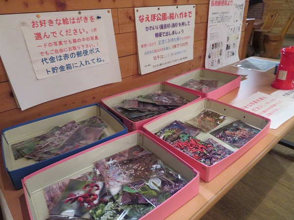 なえぼ公園の絵はがきを販売しています。3枚100円です。