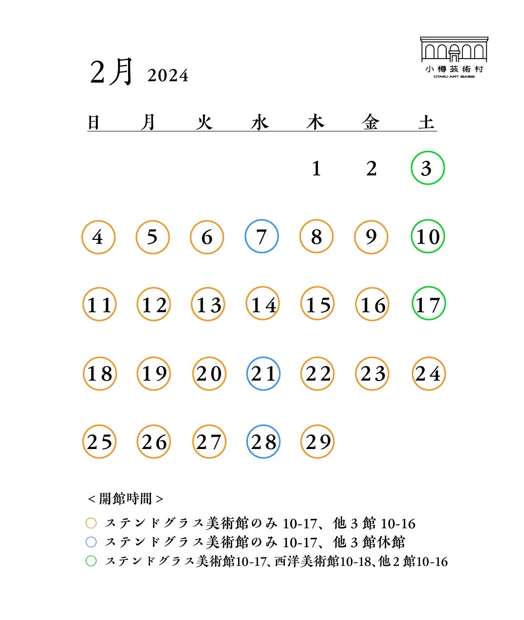 小樽芸術村・営業時間:(11月~4月まで 10:00~16:00)毎月水曜日定休.祝日のは翌日 ※2月のカレンダーはコチラから