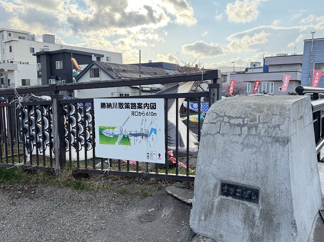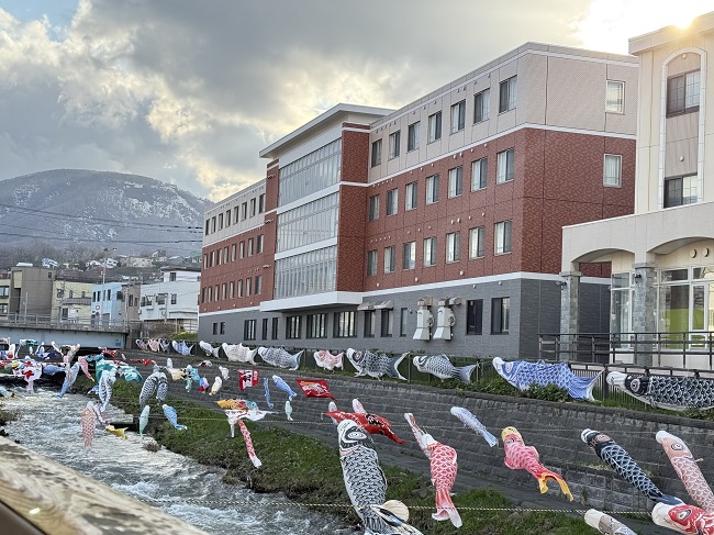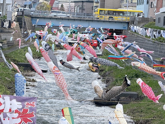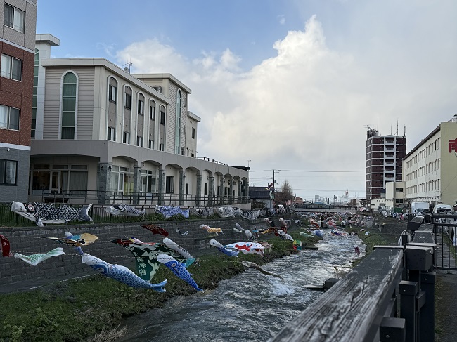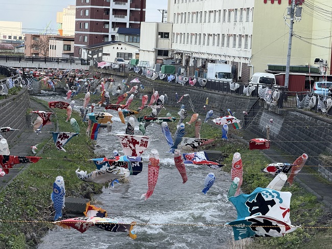 ▼(↓南樽市場横の勝納川を泳ぐ鯉のぼり][ヨ]