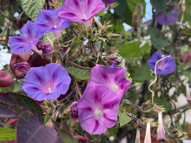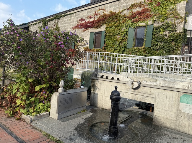 (↓浅草橋街園のふれあいの泉の朝顔はまだ咲いています。運河案内所の壁の蔦も、また少し赤みが出てきました。)[ヨ]