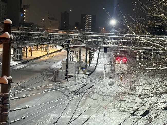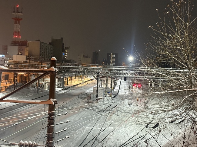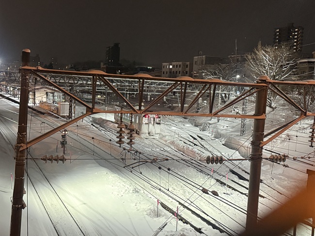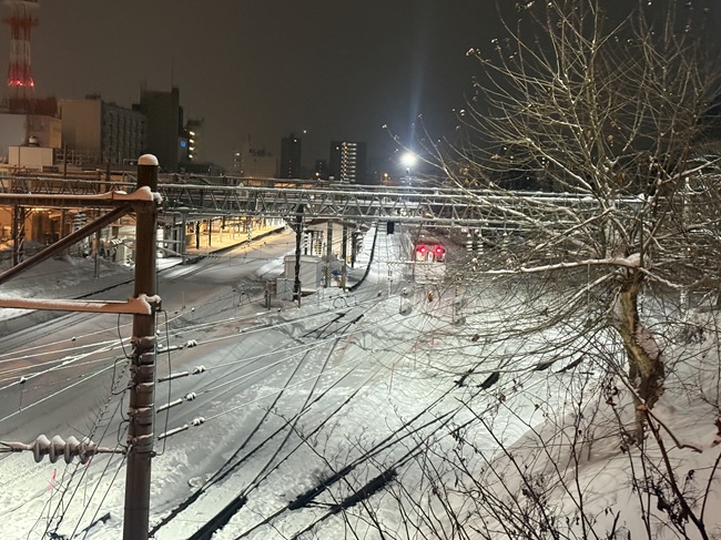 (↓1/15 18:30過ぎ…船見橋から見た小樽駅構内の雪景色。)[ヨ]