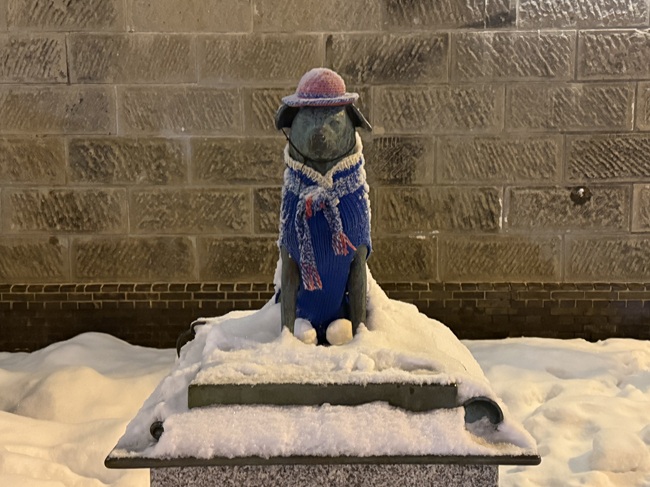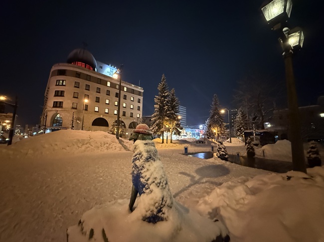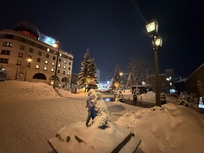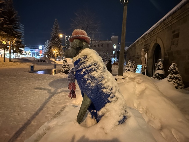(↓1/21 20:20過ぎ...ルタオ運河プラザ店の前庭のぶんちゃんと臨港線沿いの夕景。)[ヨ]