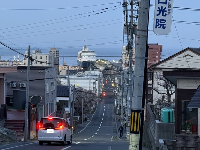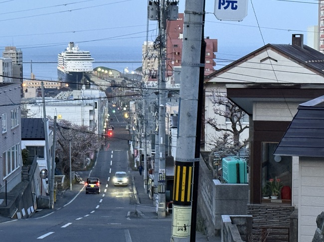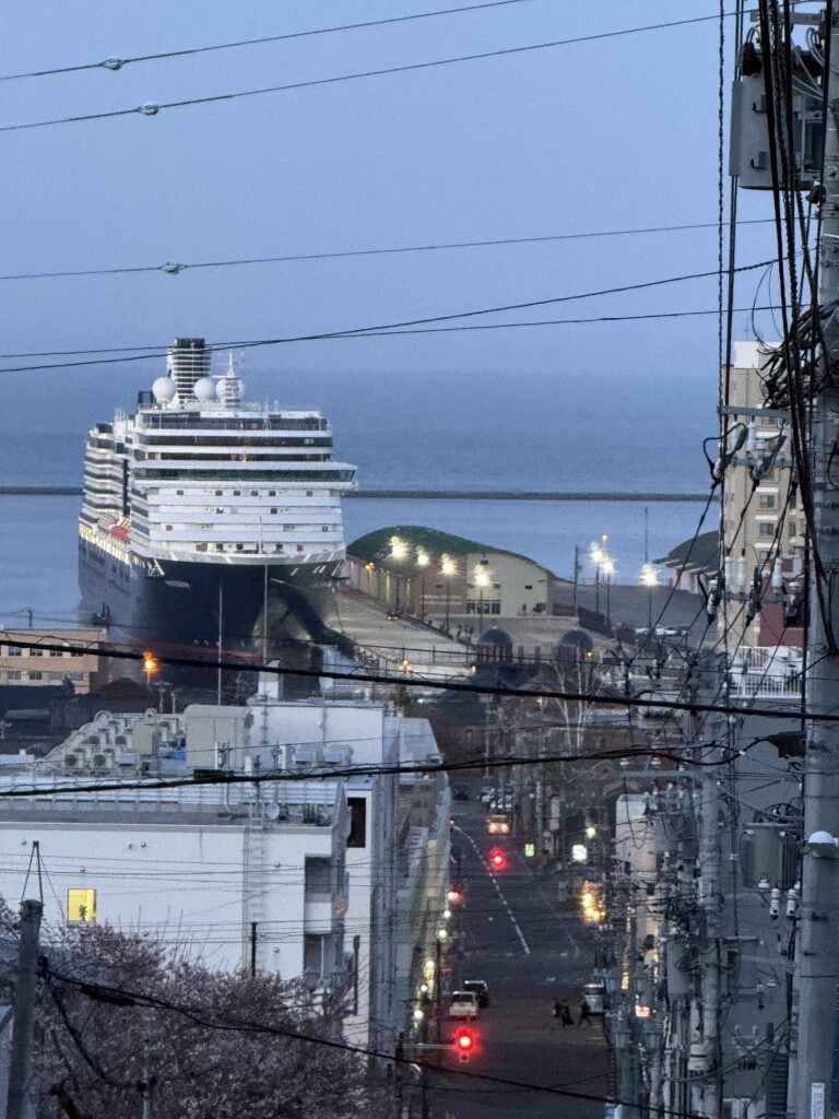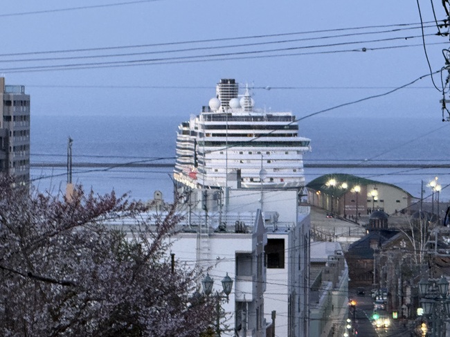 (↓4/22 18:40過ぎ…船見坂から見た小樽第3号ふ頭寄港中のクルーズ船「ウエステルダム」。)[ヨ]