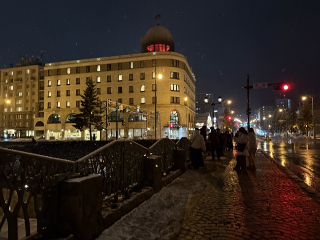 (↓3/9 20:10過ぎ…細かい雪の中央橋からの夕景。)[ヨ]