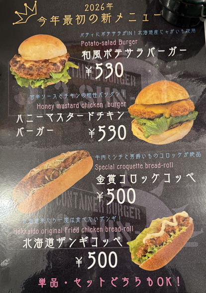 コンテナビレッジでは、新商品の「和風ポテサラバーガー・ハニーマスタードチキンバーガー・金賞コロッケコッペ・北海道ザンギコッペ」4種類が本日より販売開始しました。