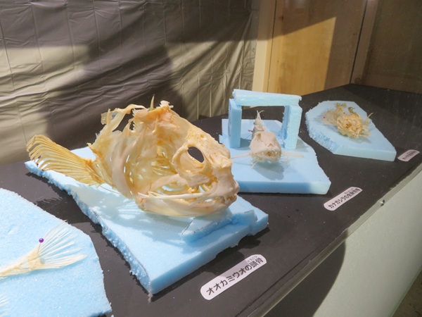 お客様が触れるように加工する他、魚の耳石などのホネを観察する展示行います。
