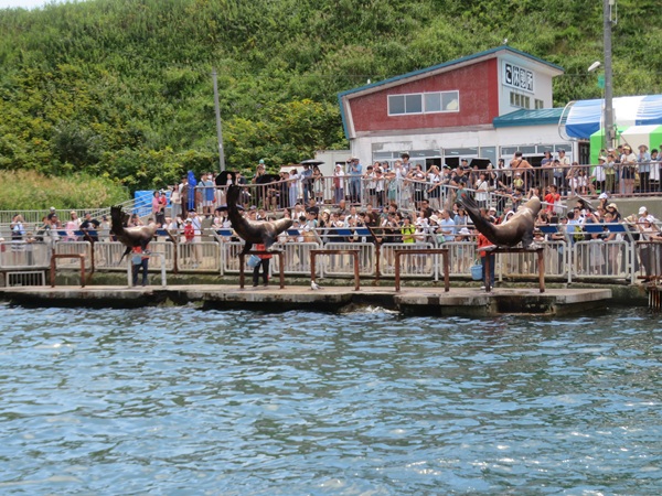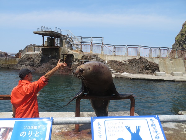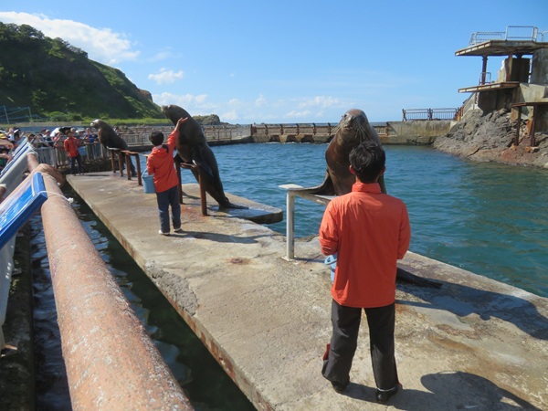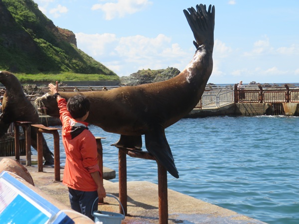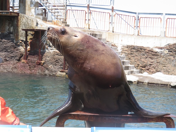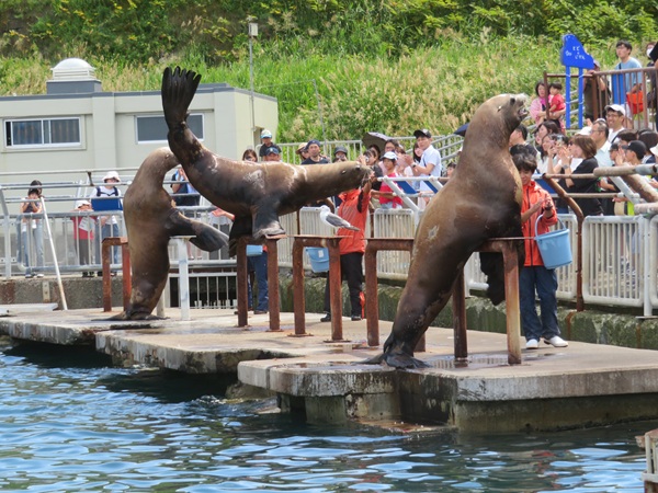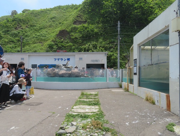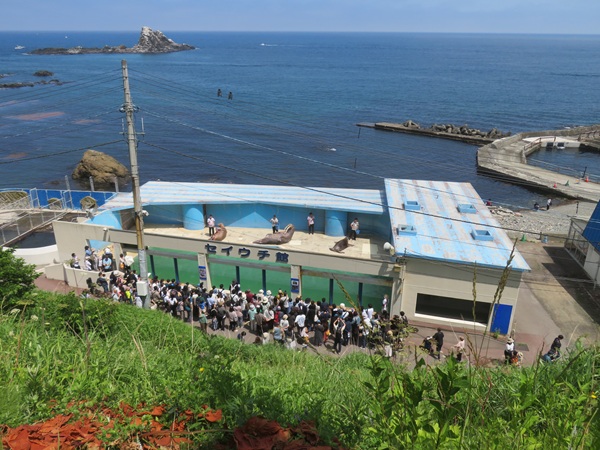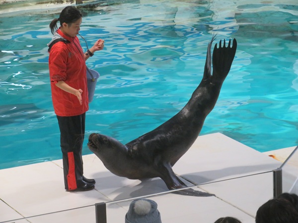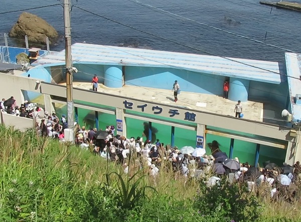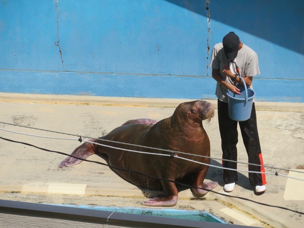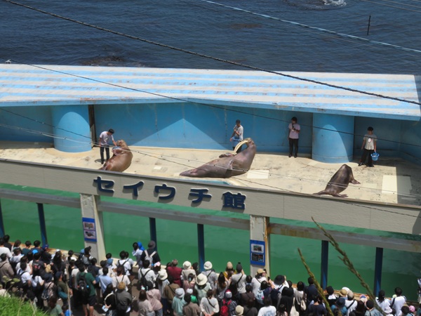 飼育スペースから外へ出て、お客様のすぐ側を歩き海へ向かっていきます。