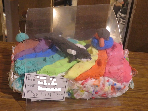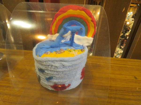 紙ねんどでイルカとにじを作りその下で楽しそうにおよぐ魚をイメージして作りました。