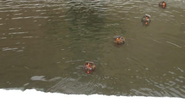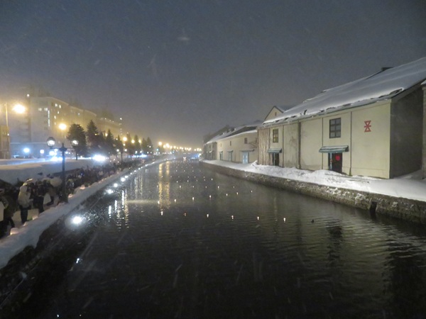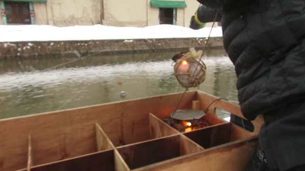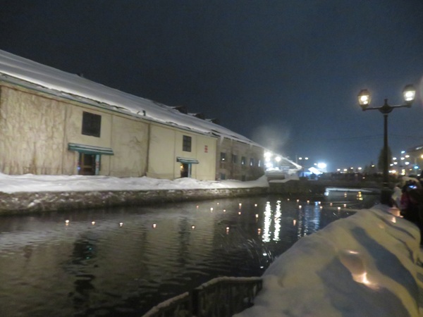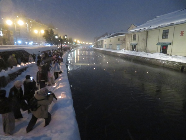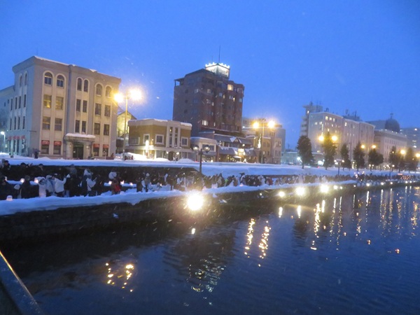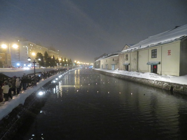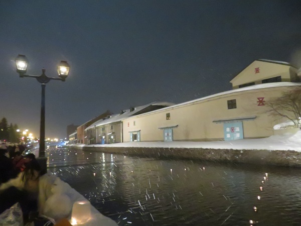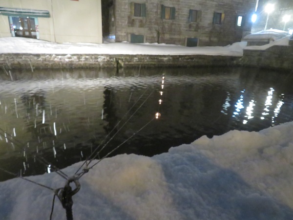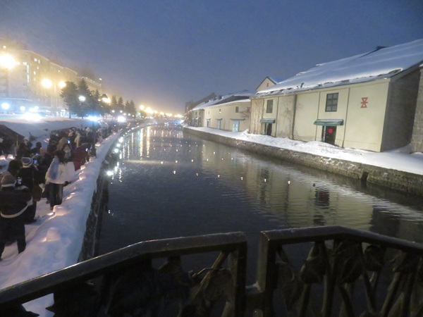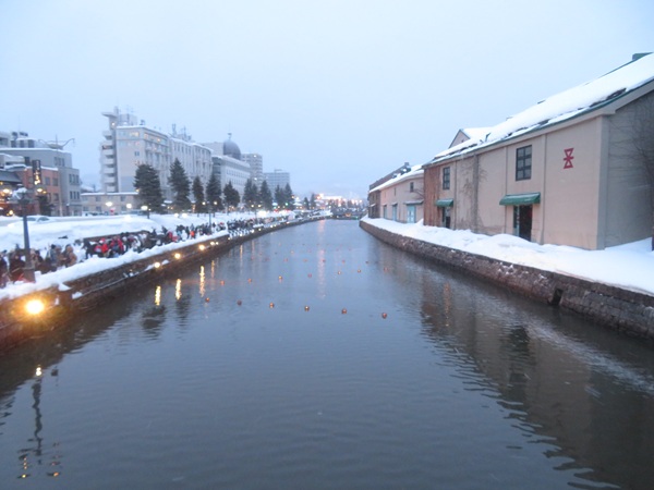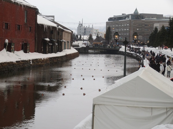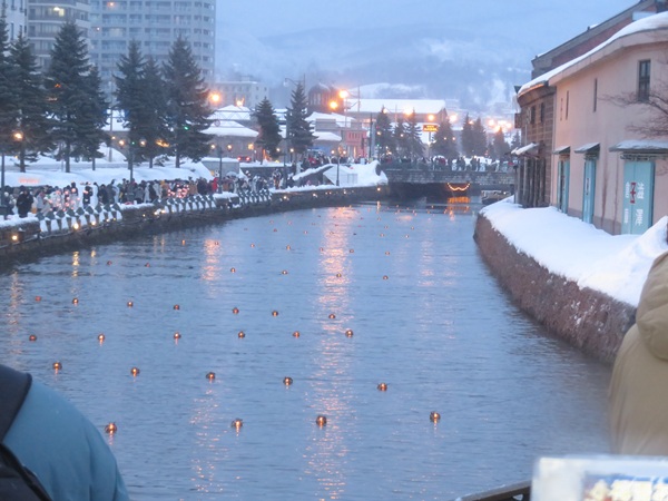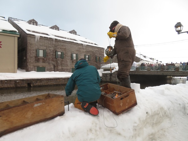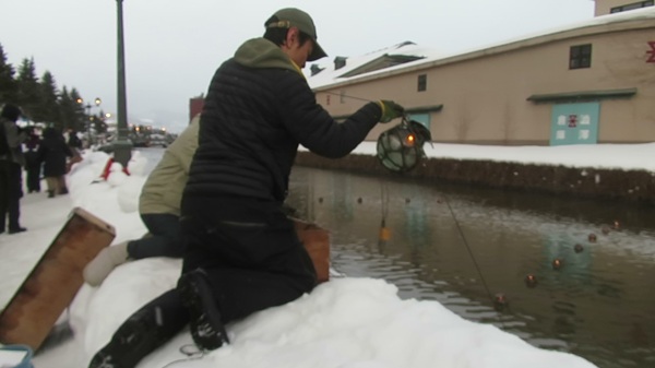 浮き玉キャンドルを小樽運河に浮かべる作業を見学しました。