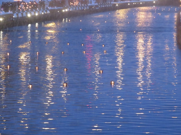中央橋から見るとすでにたくさんの浮き玉キャンドルが浮かんでいました。