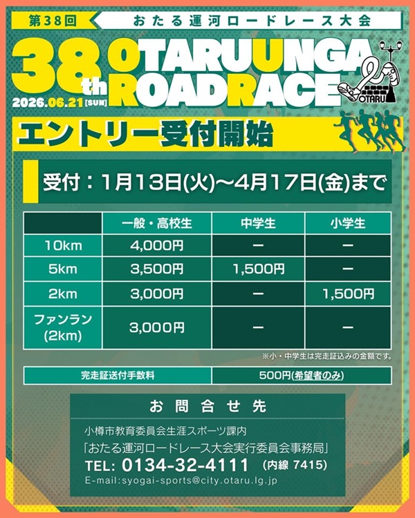 第38回おたる運河ロードレース大会(6/21)エントリー期間4/17迄