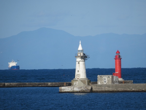 防波堤と灯台。港内遊覧中の小樽海上観光船「あおばと」です。