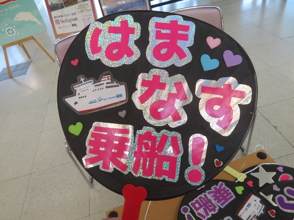 キラキラに装飾された新潟・舞鶴の4船分の推しうちわや、