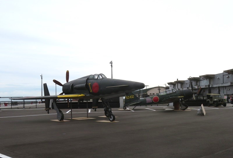 と日本海軍戦闘機「震電」の2基の戦闘機のレプリカが