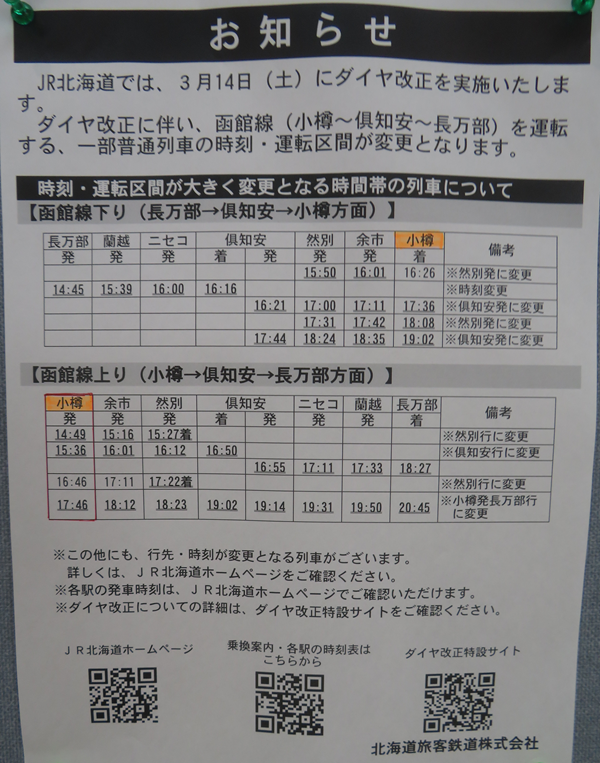 小樽駅発着の時刻も変更があります。