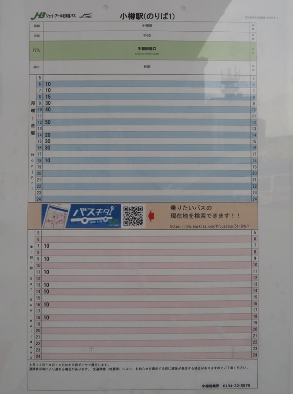 ◎ ジェイ・アール北海道バス時刻表 №1手稲・小樽方面 (2026年4月1日~)