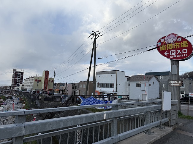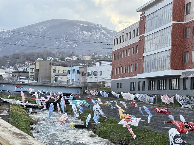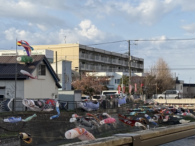 南樽市場の横を流れる勝納川に、今年も「大漁旗とこいのぼり」が飾られています。