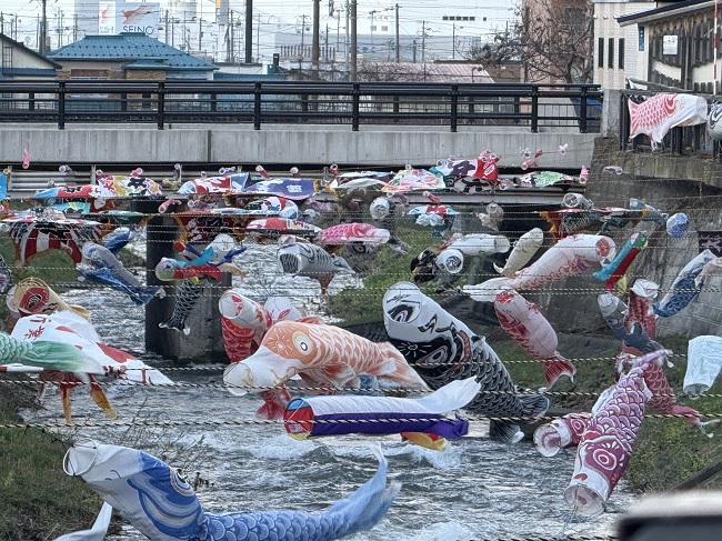 ▼眞砂橋を挟んだ海側にも鯉のぼりがなびいています。
