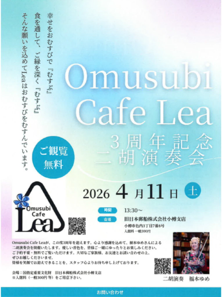Omusubi Cafe Leaが、この度3周年を迎えます。心より感謝を込めて、福本ゆめさんによる二胡演奏会を開催致します。優しい音色を、皆様ご一緒にゆったりとお楽しみください。