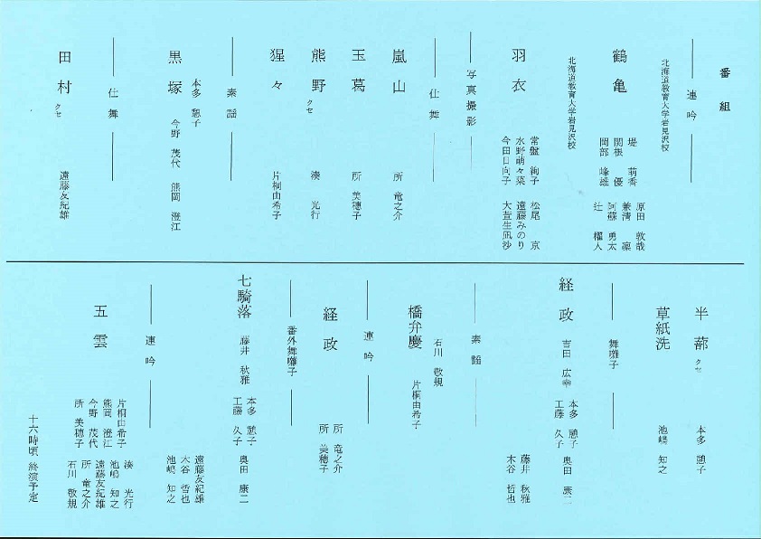 今回は会員の発表のほかにゲストとして東京から職分(プロの能楽師) である藤井秋雅様をはじめ注目の若手能楽師をお招きし、「七騎落 舞囃子」を実演していただきます。今回は楽器も揃い迫力のある演能をご覧いただけます。せっかくの機会 ですので市民の皆様にもご覧いただきたくご案内する次第でございます。