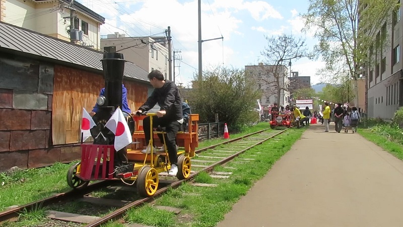 旧手宮線を足漕ぎ軌道自転車(トロッコ)が運行しています。