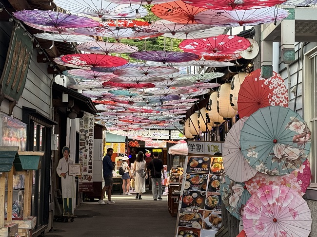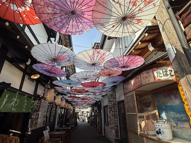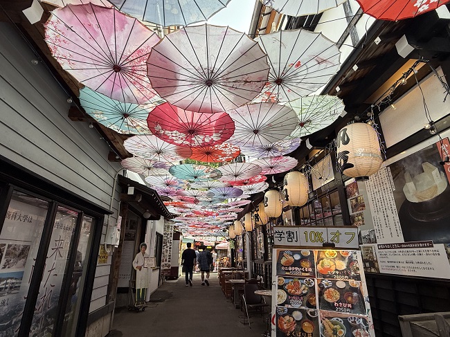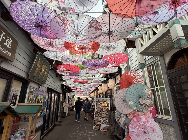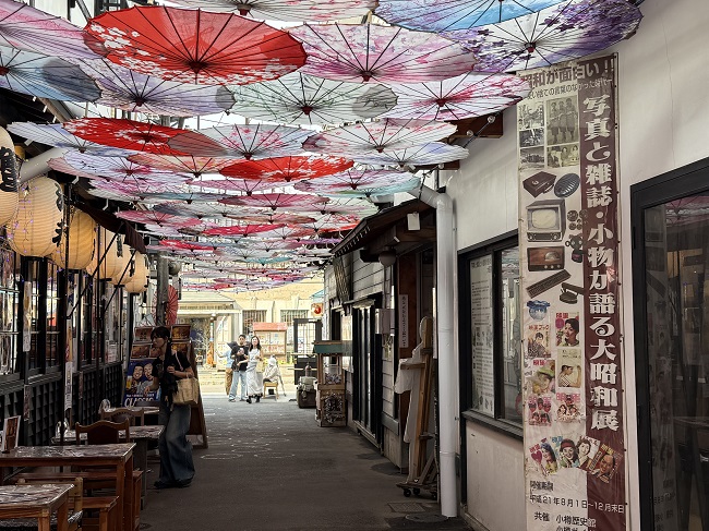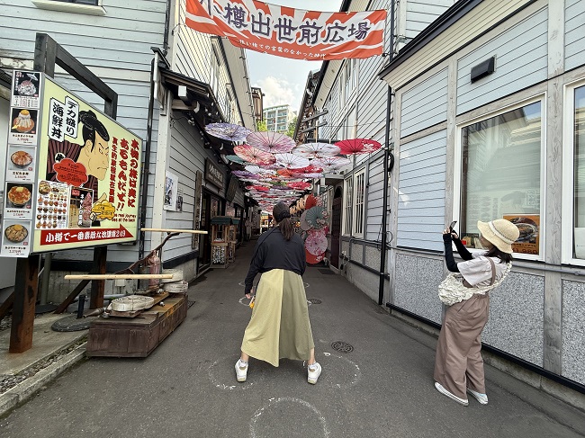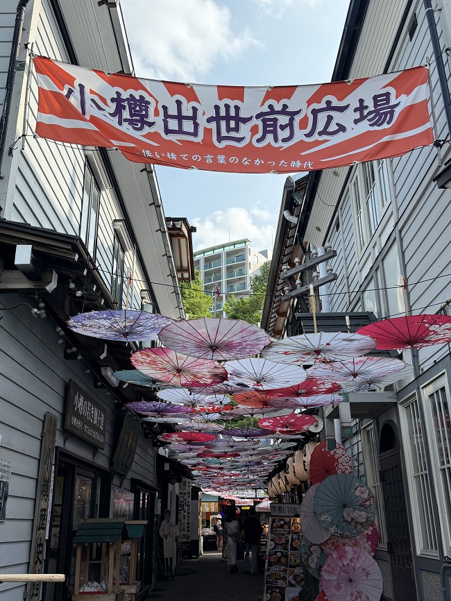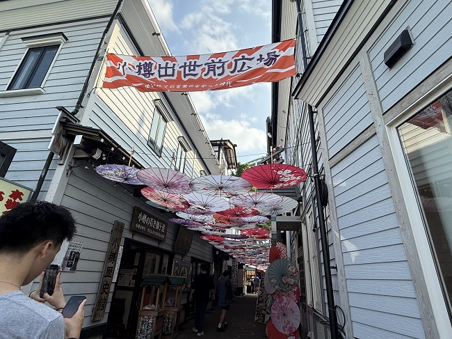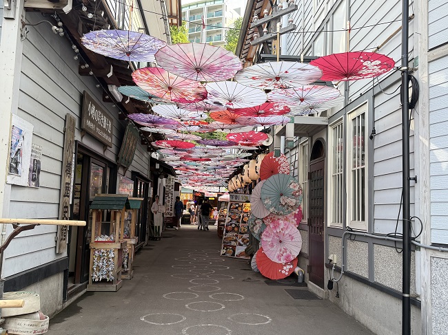 小樽町通り商店街の出世前広場広場では、人気の和傘が装飾されています。