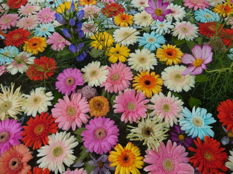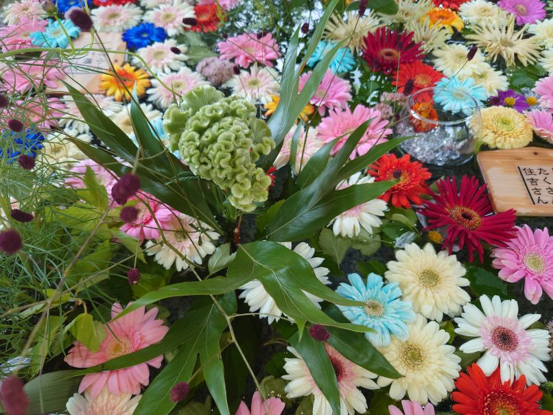 コスモス、ケイトウ、リンドウ、おもちゃメロン、シモツケ、アマランサス、