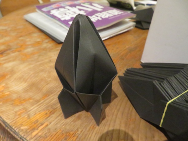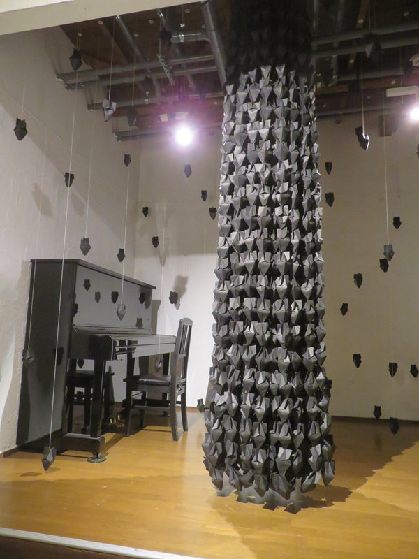 平和への祈りを込めて、黒い爆弾折り紙1300個で作る千羽鶴のような「WAR IS PEACE」