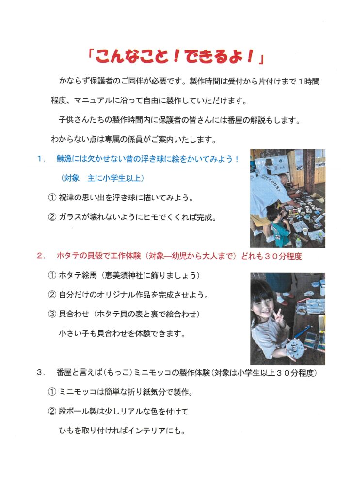 体験への参加は事前予約制となっておりますので、おたる祝津たなげ会(0134-26-6160)または事務局のワタベ(090-8899-7249)まで。