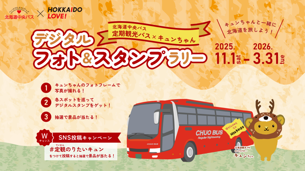北海道中央バスの定期観光バスやグループが運営する施設を周ってキュンちゃんのスタンプを集めて、みませんか?! 3つ以上集めると景品が当たる抽選に応募できます。