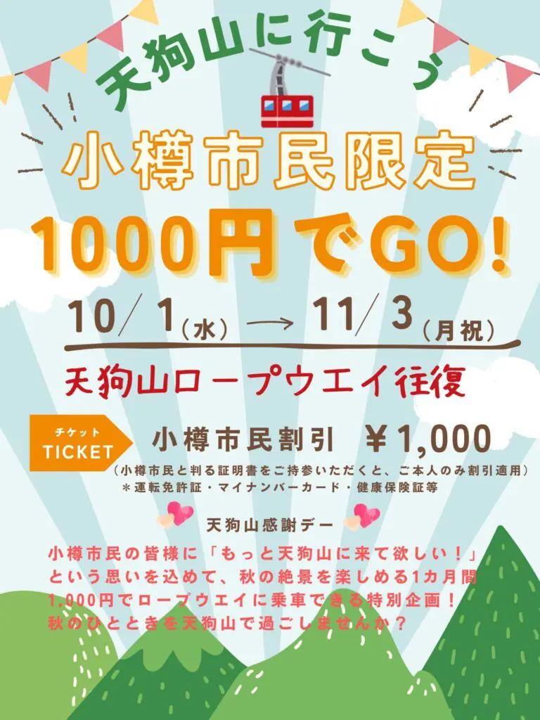 小樽市民の皆様に「もっと天狗山に来ていただきたい!」という思いを込めて、秋の絶景を楽しめる約1か月間を1000円でロープウェイにご乗車出来る特別企画です。