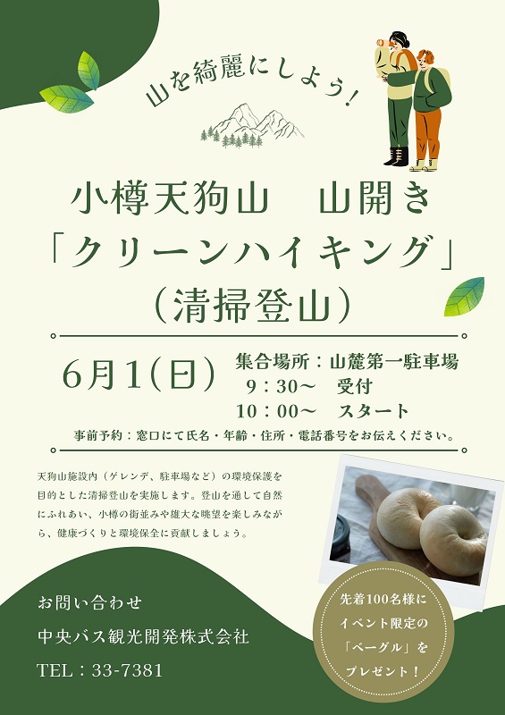 令和7年6月1日(日)に小樽天狗山の山開きイベントとして「クリーンハイキング」を開催いたします。このイベントでは、天狗山施設内(ゲレンデ、駐車場など)の環境を守るために、清掃をしながら登山を楽しむことができます。環境保護の一環として、清掃活動を行いながら天狗山の自然にふれあい、また健康づくりの一つとして登山しながら、小樽の街並みや小樽港・石狩湾・積丹半島を見渡す眺望をお楽しみいただければと考えております。