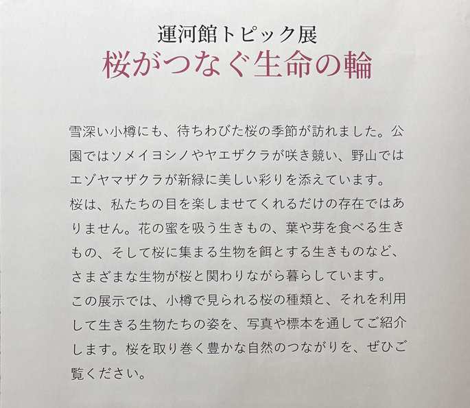小樽市内で見られるサクラ類とサクラを利用して暮らす生物たちを、写真と標本で紹介します。