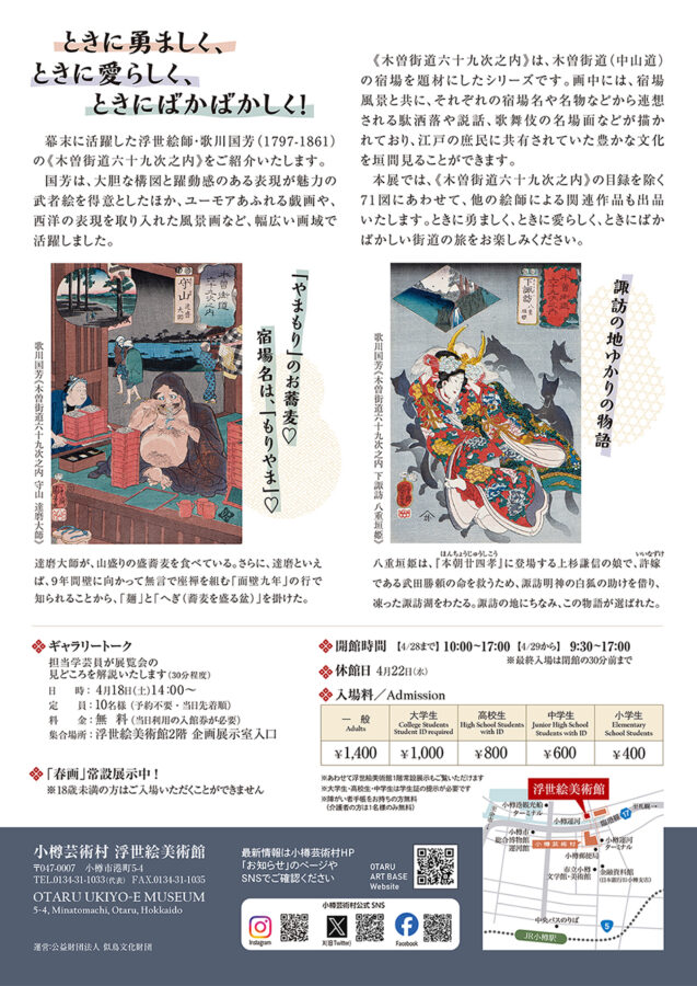 本展では《木曽街道 六十九次之内》の目録を除く71図にあわせて、他の絵師による関連作品も出品いたします。ときに勇ましく、ときに愛らしく、ときにばかばかしい街道の旅をお楽しみください。