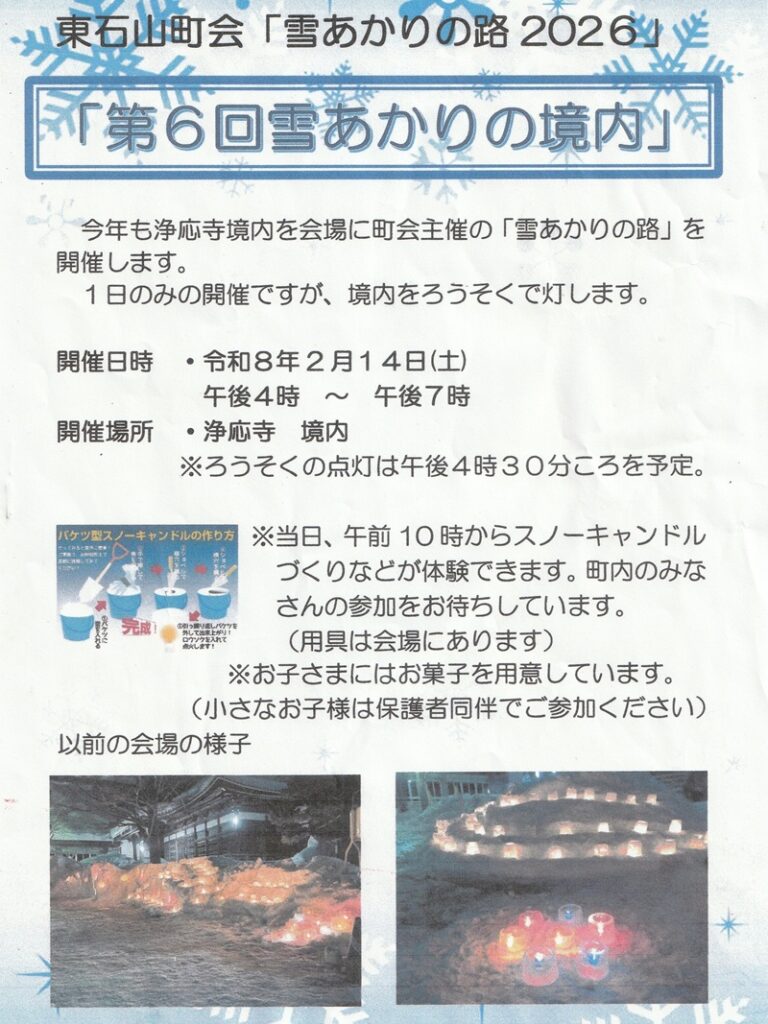 浄応寺境内会場に町会主催の「雪あかりの路」を開催します。