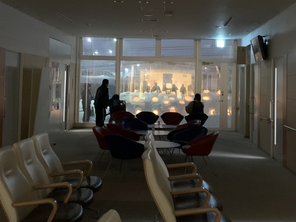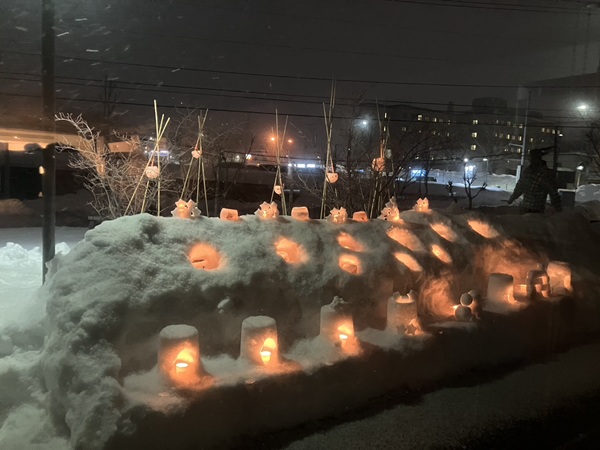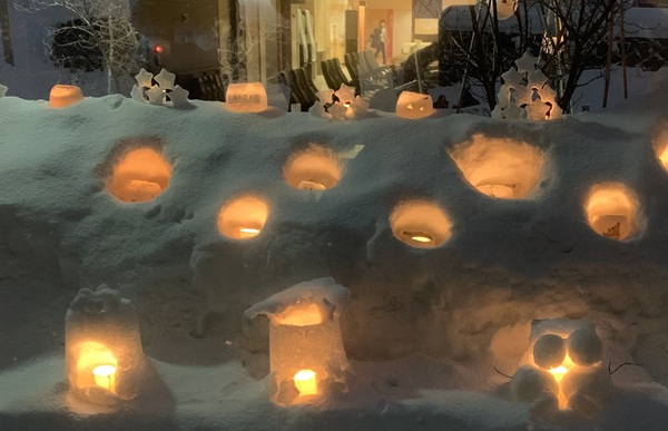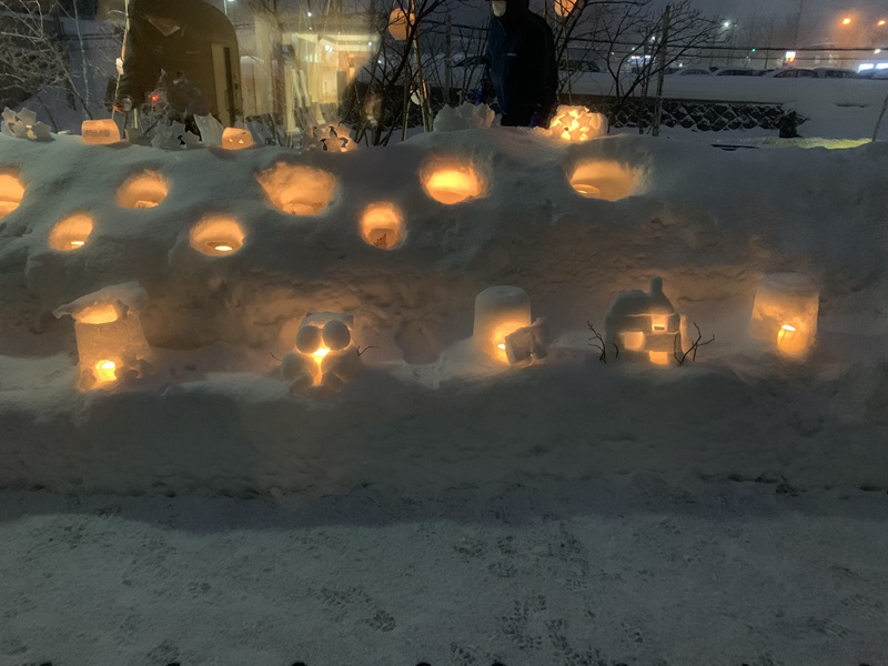 職員の皆さんの手によって制作された雪のオブジェにキャンドルが灯されました。