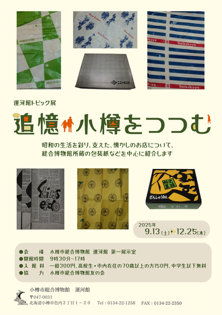 開催時期2025年 9月13日(土)終了時期2025年 12月25日(木)場所小樽市総合博物館 運河館・第一展示室お問い合わせ昭和の生活を彩り、支えた、懐かしのお店について、総合博物館所蔵の包装紙などを中心に紹介します。イベントページはこちら