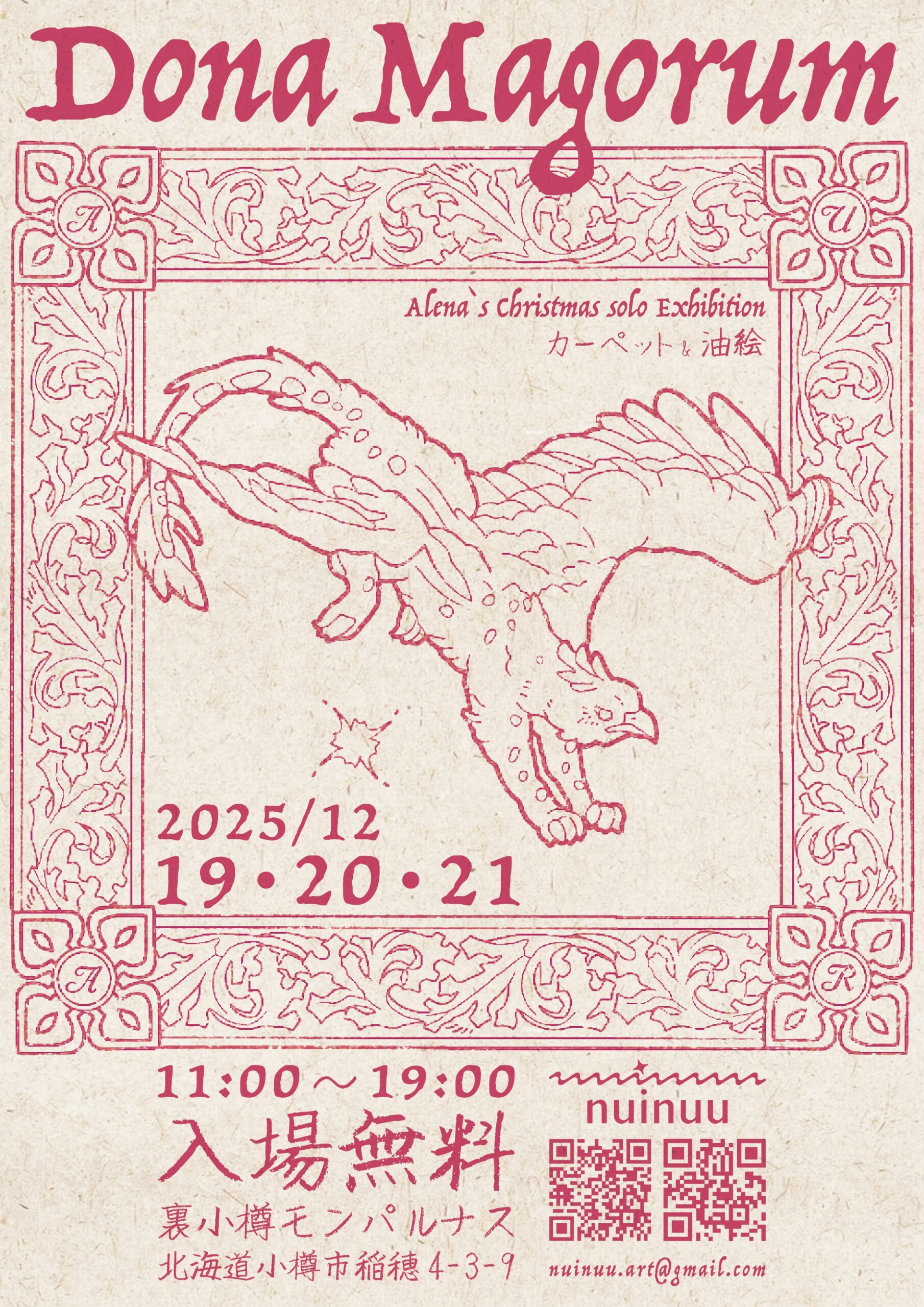開催時期2025年 12月19日(金)終了時期2025年 12月21日(日)場所裏小樽モンパルナス(小樽市稲穂4-3-9)お問い合わせAlenaさんによるカーペットと油絵の個展です。イベントページはこちら