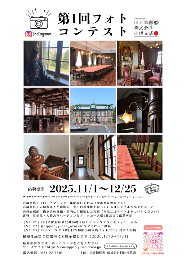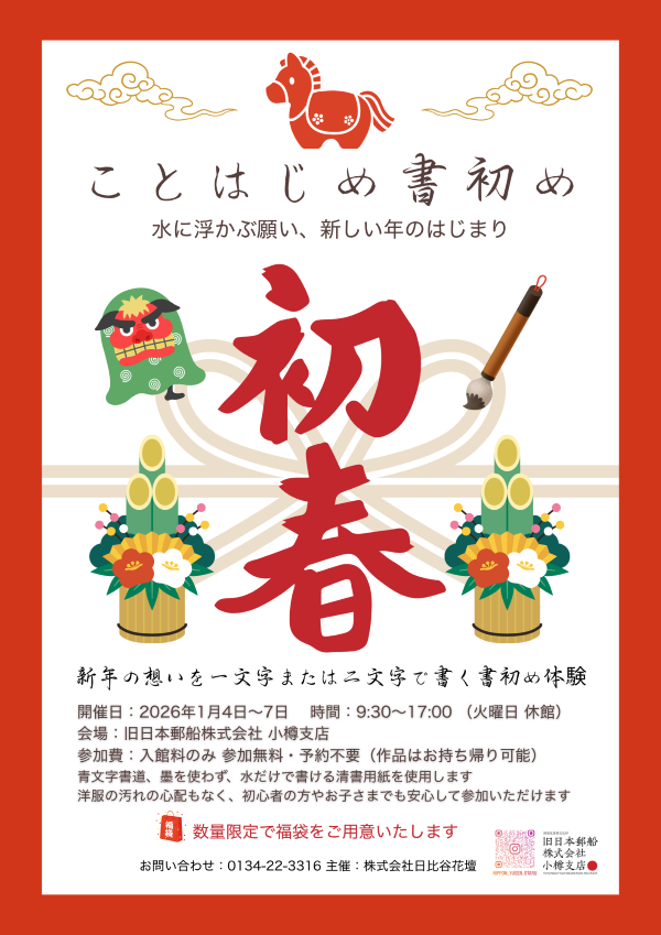 開催時期2026年 1月4日(日)終了時期2026年 1月7日(水)場所旧日本郵船㈱小樽支店お問い合わせ旧日本郵船株式会社小樽支店 0134-22-3316どなたでも参加できる書初めイベントを開催します。イベントページはこちら