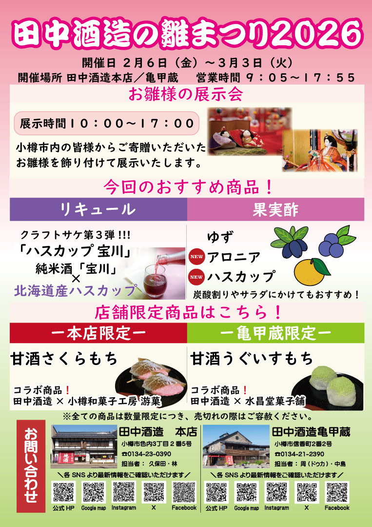 北海道に自生し、栄養が豊富で不老長寿の果実としても知られるハスカップをつかった好評のクラフトサケ「ハスカップ 宝川」を販売するほか、桃の節句に合わせ、ご家族で飲める限定商品の「フルーツビネガー」や「桃の甘酒」、そのほか毎年ご好評の酒粕入りの「甘酒さくらもち (本店限定品)」や「甘酒うぐいすもち亀甲蔵限定品)」 など、イベント期間中数量限定商品の販売を行います。