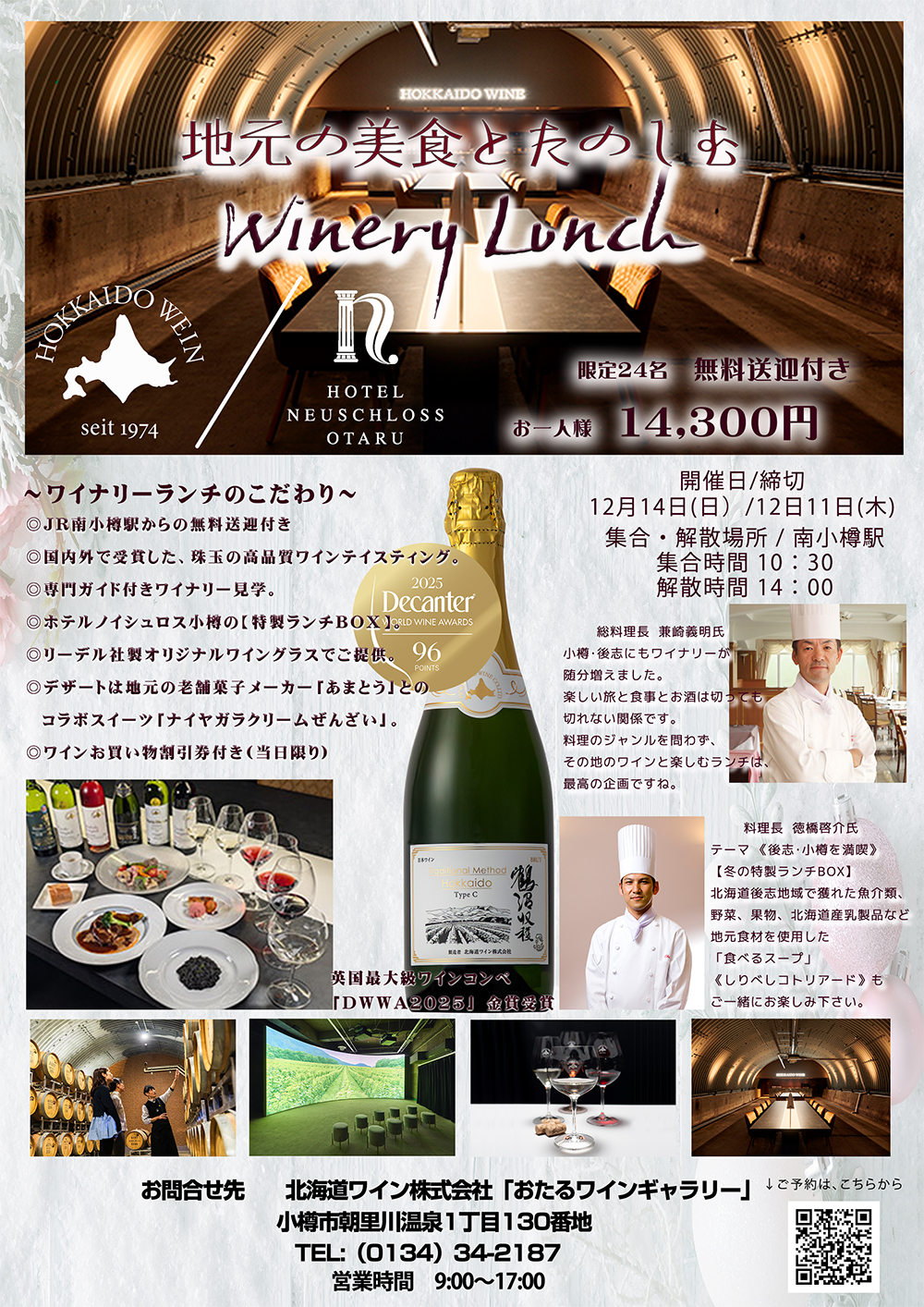 12月『地元の美食とたのしむ、ワイナリーランチ』 地元ホテル「ノイシュロス小樽」様とのコラボランチ